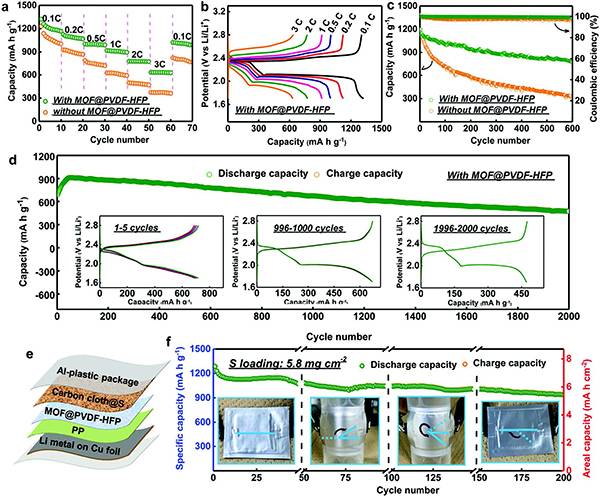 (e)具有MOF @ PVDF-HFP隔膜的柔性Li-S軟包電池的內部結構示意圖