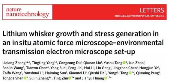 燕山大學黃建宇教授、沈同德教授和唐永福副教授等聯合美國佐治亞理工學院朱廷教授和賓夕法尼亞大學張宿林教授,在Nature Nanotechnology發表題為“Lithium whiskers growth and stress generation in an in situ atomic force microscope-environmental transmission electron microscope setup”的研究論文,實時、直觀地記錄了鋰枝晶生長的微觀機制,精準測定了其力學性能和力—電耦合特性,并提出固態電池中抑制鋰枝晶生長的可行性方案。張利強博士和楊婷婷博士研究生為論文的共同第一作者。