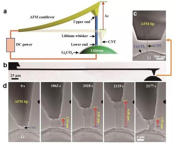 研究者們將原子力顯微鏡(AFM)和環境透射電子顯微鏡(ETEM)相結合,實現原位納米尺度鋰枝晶生長及其力學性能、力-電耦合精準測定。發現鋰枝晶生長過程中可產生的應力高達130MPa, 通過原位壓縮實驗發現鋰枝晶屈服強度高達244MPa,這一數值遠高于宏觀金屬鋰的屈服強度(——1MPa)。