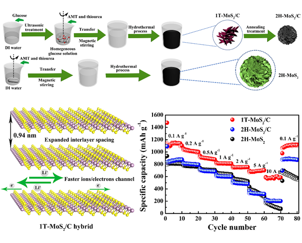 圖3. 1T-MoS2/C復(fù)合材料的合成過程、反應(yīng)機制示意圖及倍率性能。