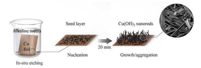 相比于金屬氧化物,金屬氫氧化物通常能夠提供更高的容量,因此近年來金屬氫氧化物的研究得到了較多的關(guān)注。Cu(OH)2納米棒的合成方法如下圖所示,首先采用去離子水配置2.5M NaOH和0.125M (NH4)2S2O8的混合溶液,銅箔在乙醇中清洗干凈后放入到該混合溶液處理20min,在該過程中發(fā)生的反應(yīng)如下式所示,經(jīng)過20min的腐蝕,Cu箔表面生成了大量的Cu(OH)2納米棒,隨后銅箔經(jīng)過乙醇和去離子水清洗后進(jìn)行常溫干燥。