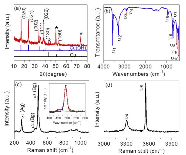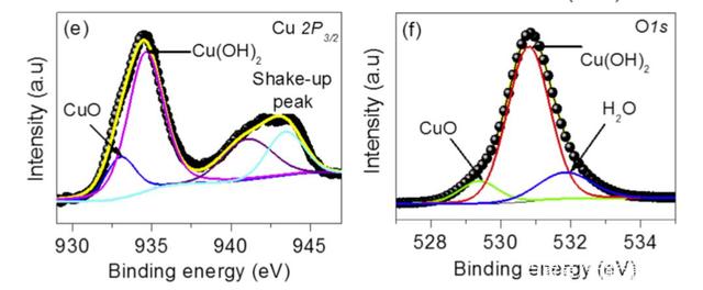 下圖a為處理后的Cu箔的XRD圖譜,從圖中能夠看到銅箔中主要存在Cu(OH)2和Cu兩種晶相。這一結(jié)果進(jìn)一步被下圖b、c、d中所示的拉曼光譜數(shù)據(jù)所證實(shí)。比表面測試發(fā)現(xiàn)該材料的比表面積達(dá)到了6.661m2/g,平均孔尺寸為92.71nm。為了分析Cu箔表面的化學(xué)狀態(tài),作者進(jìn)行了XPS分析,Cu 2p圖譜中在933.07eV和934.64eV存在兩個特征峰,分別對應(yīng)CuO和Cu(OH)2,從O 1s圖譜中我們也進(jìn)一步確認(rèn)了這兩種物質(zhì)的存在。