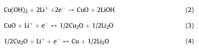 下圖b為Cu(OH)2納米棒的充放電曲線(電壓范圍為0.005-3.0V),從圖中能夠注意到在放電的過程中在1.57V、1.26V和0.9V附近出現(xiàn)了電壓平臺,其中在1.57V附近對應(yīng)的為Cu(OH)2不可逆的分解為CuO(如下式2所示),1.26V電壓平臺對應(yīng)的為CuO分解為Cu2O,0.9V附近的電壓平臺對應(yīng)的則為Cu2O進(jìn)一步分解為Cu。Cu(OH)2納米棒首次放電比容量達(dá)到2145mAh/g,但是在第二圈循環(huán)中放電容量就下降到了1569mAh/g,并最終穩(wěn)定在了1472mAh/g。但是在隨后的循環(huán)中充放電曲線則幾乎重合,這表明電極良好的可逆性和界面穩(wěn)定性。但是我們也注意到在后續(xù)的循環(huán)過程中,電池的充電容量總是高于放電容量,電池的庫倫效率也降低到了70%,作者認(rèn)為這可能是因?yàn)椴牧系慕Y(jié)構(gòu)變化,以及銅箔集流體在循環(huán)過程中的氧化等原因。