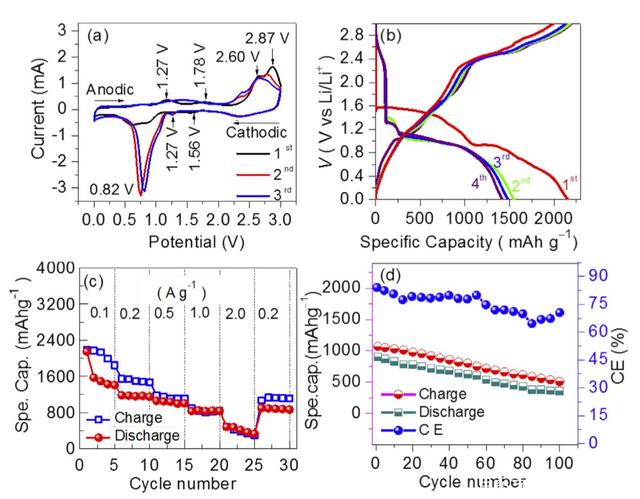 下圖a為Cu(OH)2納米棒的循環(huán)伏安曲線,從下圖可以看到Cu(OH)2納米棒的首次充放電曲線與后續(xù)的兩次充放電曲線之間存在著明顯的區(qū)別,這可能是由于極化和生成SEI造成的。在還原掃描的過程中第一個還原峰出現(xiàn)在0.75V附近,對應(yīng)的是Cu(OH)2的分解,其余的兩個還原峰分別出現(xiàn)在0.46V和0.31V、,對應(yīng)的是電解液的分解,在氧化掃描的過程中氧化峰出現(xiàn)在0.77V、1.36V、1.97V,對應(yīng)的是Cu再次被氧化成為Cu2O,最終氧化為CuO,整個充放電過程中的電化學(xué)反應(yīng)如下式所示。
