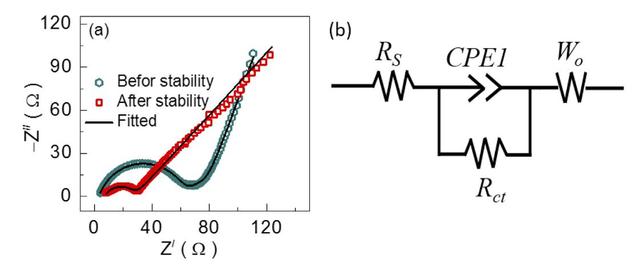 下圖為Cu(OH)2納米棒材料在循環(huán)前后的交流阻抗圖譜,作者根據(jù)下圖b中所示的等效電路對交流阻抗數(shù)據(jù)進(jìn)行了擬合,擬合結(jié)果顯示循環(huán)前Cu(OH)2納米棒的電荷交換阻抗為56.75Ω,而循環(huán)后電荷交換阻抗降低到了21.05Ω,這可能是由于反復(fù)的循環(huán)過程中Cu(OH)2納米棒發(fā)生了顯著的結(jié)構(gòu)變化。