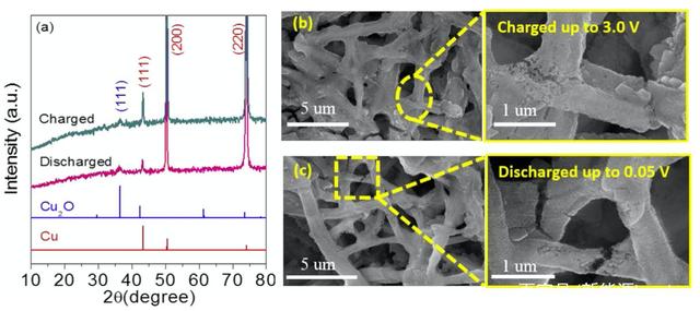 下圖b和c為Cu(OH)2納米棒在充放電后的表面形貌,從圖中能夠看到在充電狀態(tài)下Cu(OH)2納米棒發(fā)生了顯著的體積膨脹和團(tuán)聚,表面狀態(tài)非常粗糙。在放電狀態(tài)下,Cu(OH)2納米棒體積收縮,但是仍然存在由于體積膨脹產(chǎn)生的結(jié)構(gòu)破壞,結(jié)構(gòu)破壞造成了部分活性物質(zhì)無法參與到充放電反應(yīng),從而造成了容量損失。