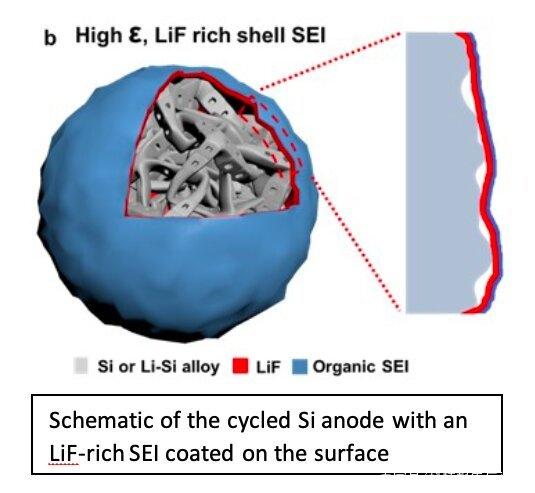 研究人員研究的最終目標(biāo)是確定一種通用的、即插即用的解決方案,以促進(jìn)鋰基電池高容量陽(yáng)極的開(kāi)發(fā)。為了實(shí)現(xiàn)這一目標(biāo),他們使用最先進(jìn)的鹽LiPF6和乙醚溶劑的混合物設(shè)計(jì)了電解液,形成了非常堅(jiān)固的富含LiF的SEI保護(hù)層。