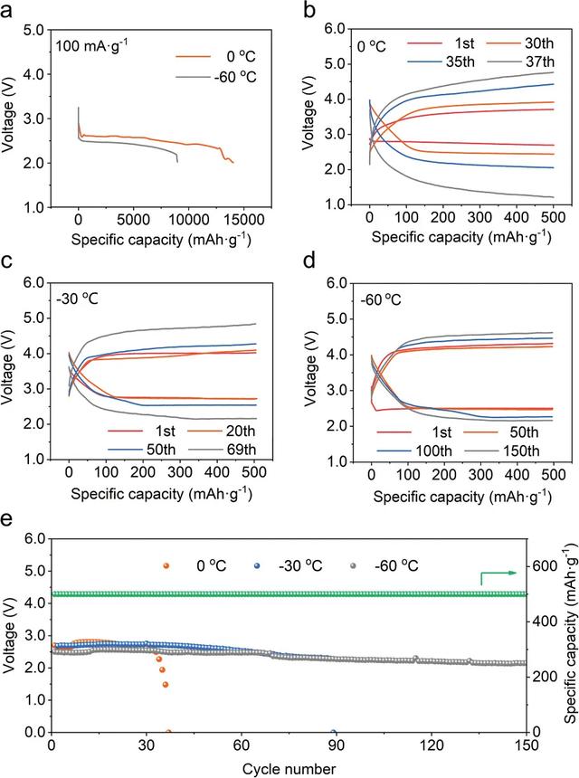 圖2. Li-CO2電池在超低溫環(huán)境下工作的電化學(xué)性能。