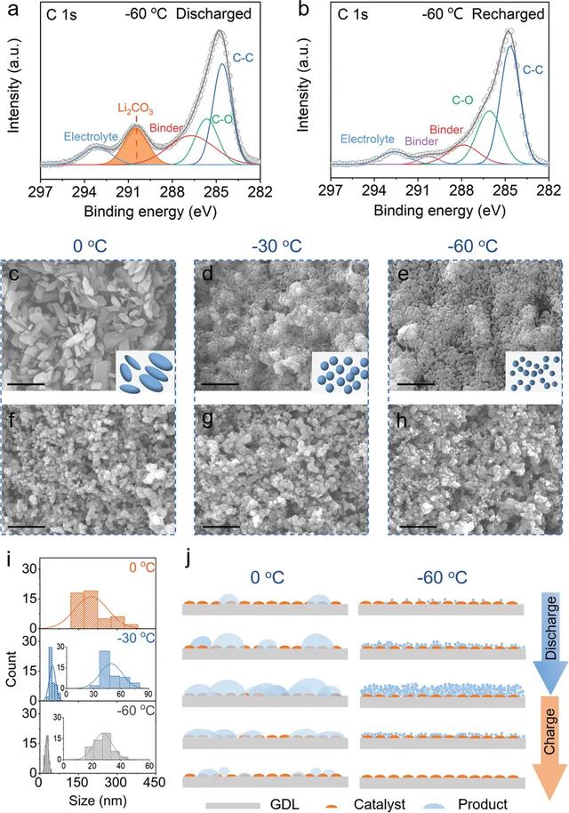 SEM表征顯示,放電產(chǎn)物的形態(tài)也會(huì)隨溫度而顯著變化。在0℃進(jìn)行初始放電后,循環(huán)后的陰極被尺寸為100-300 nm的薄片覆蓋(圖3c)。隨著溫度進(jìn)一步降低到-30和-60℃,產(chǎn)物逐漸演變成直徑為50-70 nm(圖3d)和30-50 nm(圖3e)的球形顆粒。片狀和顆粒狀產(chǎn)物的產(chǎn)生表明放電產(chǎn)物的形成可能遵循溶液增長機(jī)制,而不是表面介導(dǎo)的途徑。SEM圖像進(jìn)一步顯示,在不同溫度下首次充電后,顆粒狀的放電產(chǎn)物均已從陰極完全分解去除(圖3f-h)。然而,經(jīng)過十次充放循環(huán)后,在0℃下仍有一些未分解的產(chǎn)物在陰極表面殘留,而在-30和-60℃下,放電產(chǎn)物完全分解。這說明放電產(chǎn)物的形態(tài)和結(jié)構(gòu)極大地影響了Li-CO2電池的可逆性和壽命。