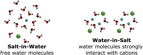 研究人員表示:“水溶鹽電解液指的是極少量的水加高濃度的鹽組成的溶液,水的量剛好能夠溶解離子,促成溶劑的形成。與傳統解決方案不同,該系統不含游離水。”此外,只有由一個大的陰離子與一個小的陽離子組成的鹽分子才可被溶解。例如,雙三氟甲烷磺酰亞胺鋰(CF3SO2NLiSO2CF3)、氯化鈉或食鹽都沒有用,因為它們的陽離子和陰離子大小相似。