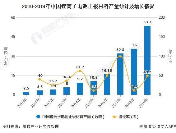 電動車等的快速發(fā)展,企業(yè)對鋰電池正極材料的投資加大,新能源汽車的發(fā)展和國家政策的支持等。根據(jù)中國有色金屬工業(yè)協(xié)會鋰業(yè)分會調(diào)研情況,2019年我國鋰電池正極材料產(chǎn)量突破50萬噸,達(dá)到53.7萬噸。