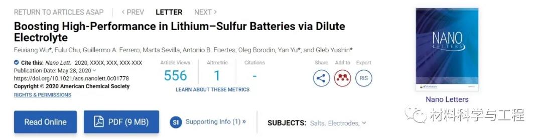 電池中穿梭效應的有效方法。但近日,中南大學吳飛翔等人的研究表明,低濃度的電解液實際上能很好的緩解穿梭效應。通過分子動力學模擬為低濃度電解液良好的電化學性能提供了理論依據。相關論文以題為“Boosting High-Performance in Lithium−Sulfur Batteries via Dilute Electrolyte”發表在Nano Letter上。