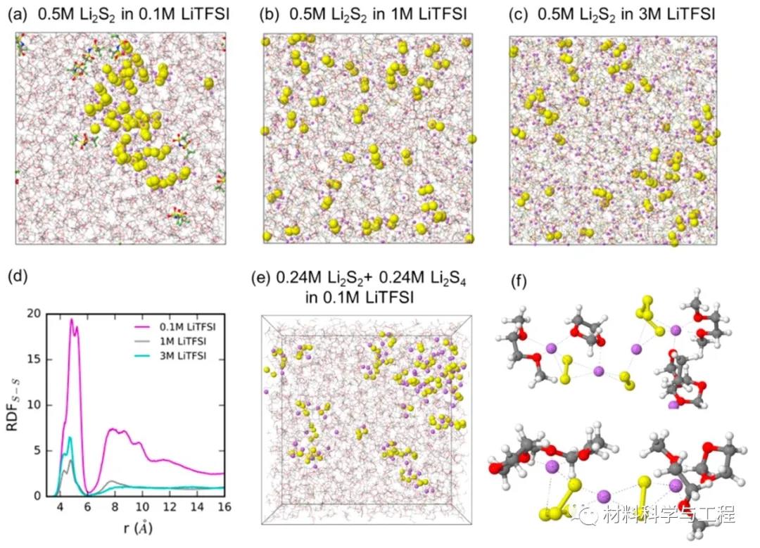圖4 (a)-(c) 和 (e) 不同電解質濃度中的分子動力學模擬結果;(d) 圖(a)-(c)所對應的分子間的徑向分布函數;(f) 圖(e)中的Li2S2−Li2S4簇結構圖。