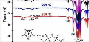 圖3. 不同溫度下離子熱鋰化反應后回收離子液體的紅外光譜。