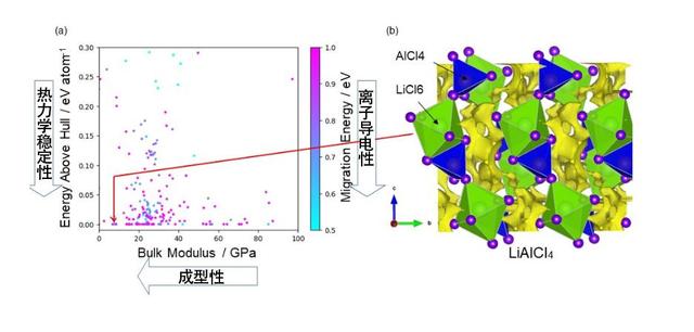 (a)針對結構數據庫中含鋰和氯的化合物,計算作為熱力學穩定性、離子導電性和成型性指標的結果。(b)研究團隊關注的LiAlCl4的晶體結構與計算的鋰離子導電路徑(黃色部分)。