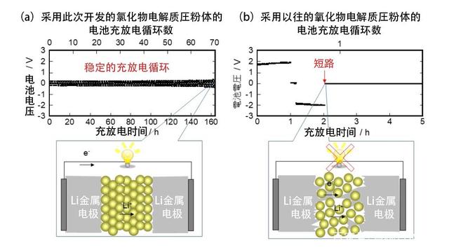 將這些固體電解質材料應用于采用鋰金屬電極的全固態電池,通過試驗確認(圖3),以往的氧化物電解質材料在第一次充放電循環中就會發生短路,而此次研究的氯化物材料實現了70次的穩定充放電循環。