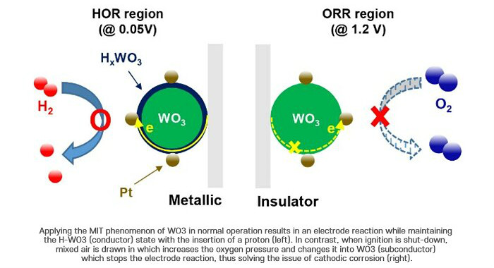 研究人員特別關注于氧化鎢(WO3)。一般而言,氧化鎢被用作電子變色材料,可通過插入和還原質子改變電導率。在汽車正常工作時利用氧化鎢的MIT現象,通過插入一個質子,在維持H-WO3(導體)轉態的同時產生電極反應。然后,當汽車點火停止時,混合空氣會被引入,使氧氣壓力升高,并將其變成WO3(次導體),使電極反應停止,從而解決了陰極腐蝕的問題。