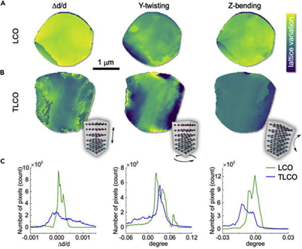 圖3. 未摻雜和Ti-Mg-Al摻雜LiCoO2顆粒內部結構缺陷分布對比