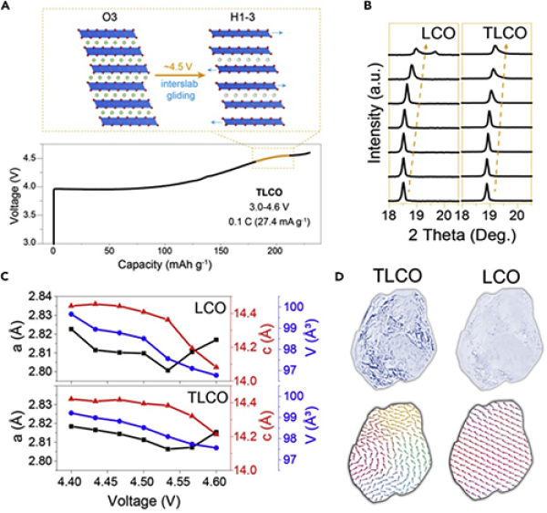 電池具有高的體積能量密度,因此鈷酸鋰是消費電子用鋰離子電池中應用廣泛的正極材料。隨著消費電子產品對鋰離子電池續航時間的要求不斷提高,迫切需要進一步提升電池體積能量密度。提高鈷酸鋰電池的充電電壓可以提高電池的體積能量密度,因此開發下一代更高電壓的鈷酸鋰材料已經成為科研界及企業共同關注的熱點。目前,鈷酸鋰電池充電截止電壓已經從1991年最早商業化時的4.20V逐漸提升至4.45V(vs Li/Li+),體積能量密度已經超過700Wh/L。然而隨著充電電壓的提高,鈷酸鋰材料會逐漸出現不可逆結構相變、表界面穩定性下降、安全性能下降等問題,限制了其實際應用。