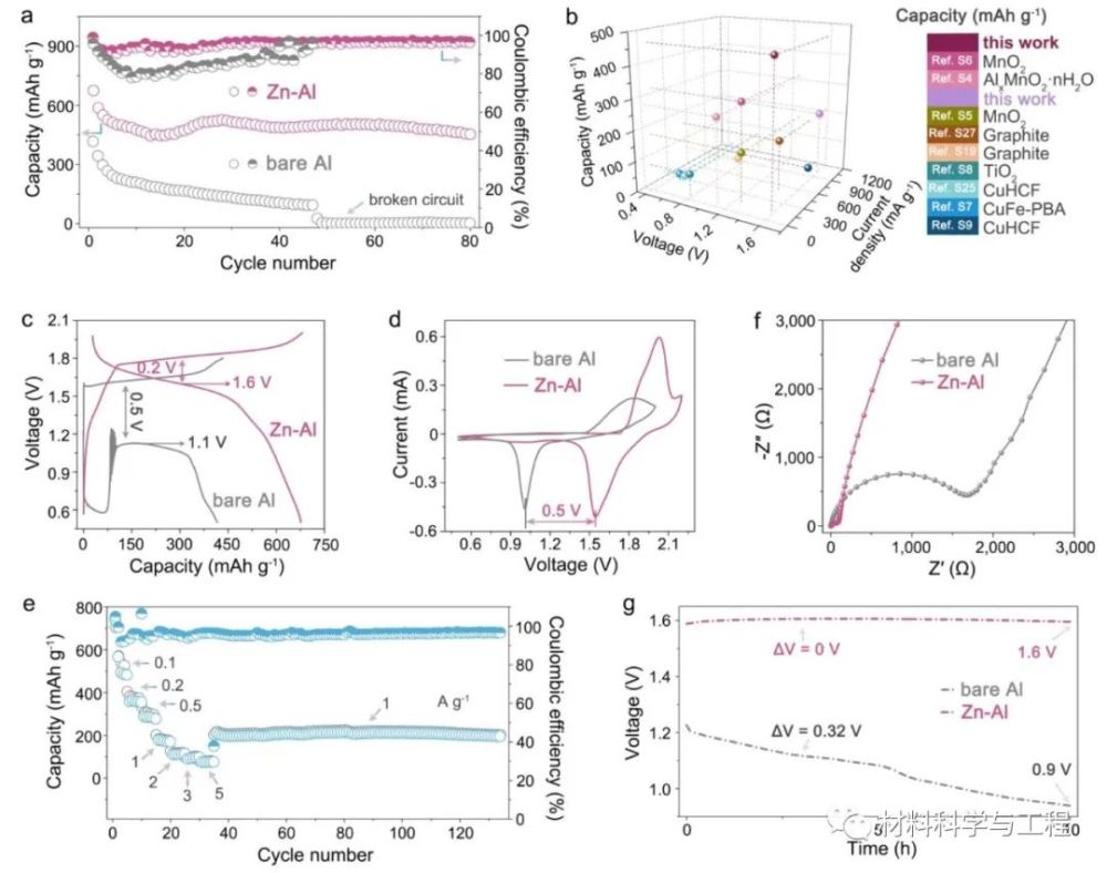 本文作者針對以上問題,利用MnO原位反應成AlxMnO2作為正極,并提出通過簡單地電鍍,制備Al-Zn合金作為AAIB負極材料。該方法僅在Zn箔上通過簡單地電鍍制成,并且Al負極中Zn元素的加入可以有效地抑制鈍化和自放電反應,并大大提高庫倫效率(通過抑制與氫氣的副反應)。并且由于Al3+較Zn2+的電位更低,在充放電過程中Al3+會形成一個正電荷靜電“盾”,抑制金屬枝晶的生長。種種優勢也電化學測試中得到體現:所制備的AAIB放電電壓高達1.6V,并在100 mA h g-1的電流密度循環80圈后比容量達到空前的460 mA h g-1,是迄今為止所報道的放電電壓比容量和最高AAIB電池。