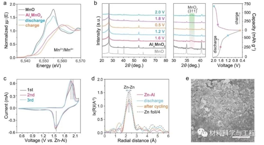 圖5 (a)充放電后AlxMnO2的XANES光譜圖;(b) AlxMnO2正極在第一次循環中的非原位XRD圖;(c) AAIB全電池的CV曲線圖;(d)-(e)循環后Al-Zn負極的EXAFS光譜圖和SEM圖。