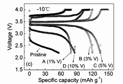 與此相似,Jin等利用V2O3的良好導電性,將其涂覆在LiFePO4表面,并測試了涂覆后樣品的電化學性能。對鋰離子的研究表明,良好導電性的V2O3層可以顯著促進LiFePO4電極中的鋰離子傳輸,由此V2O3改性的LiFePO4/C電池在低溫環境表現出優異的電化學性能,如圖6所示。