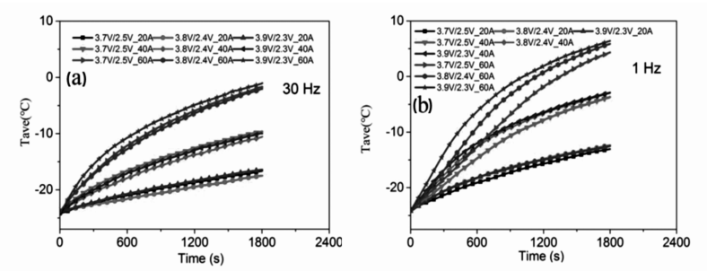 圖2 頻率分別為30Hz(a)和1Hz(b)的脈沖電流以不同電流強度和電壓范圍對鋰電池充電時電池溫度隨時間的變化