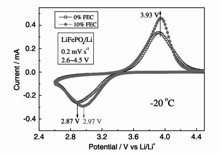 圖4 在 -20℃時LiFePO4電池在含有體積分數0%和10%FEC電解質中的循環伏安圖