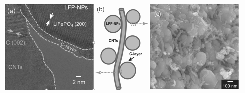 圖5 LFP@C/CNT納米復合材料的HRTEM圖(a),結構示意圖(b)及SEM圖