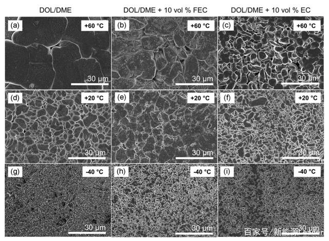 但是在較低的溫度下(20℃和-40℃),在添加FEC電解液中沉積的金屬鋰顆粒成為最大,在20℃下達到84 um2左右,在-40℃下達到10.0 um2左右,而在純醚類溶劑中,-40℃下沉積的金屬鋰顆粒面積只有3.0 um2左右,是最小的。