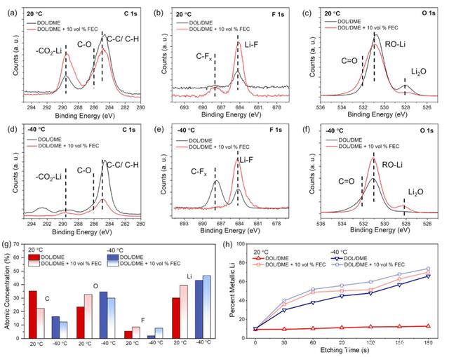 下圖為采用XPS分析的在20℃和-40℃條件下金屬鋰表面形成的SEI膜的成分分析,從下圖a-f能夠看到在純的醚類電解液中,在低溫下形成的SEI膜中含有較少的碳酸鹽和有機成分。添加FEC的電解液中也觀察到了類似的現象,但是相比之下,添加FEC的電解液中形成的SEI膜中含有更多的碳酸鹽成分(289.7eV)。從下圖b和e所示的F 1s圖譜中能夠看到,添加FEC的電解液中形成的SEI膜含有更多的LiF成分。在O 1s圖譜中能夠看到,在低溫下,添加FEC的電解液中形成的SEI膜中含有更多的Li2O成分。總的來看,在醚類電解液中添加FEC溶劑后能夠提升SEI膜中無機成分的含量,而較高的無機成分能夠形成更為致密的SEI膜,并具有更好的離子電導率,從而有效的提升金屬鋰的界面穩定性,改善電池的循環性能。