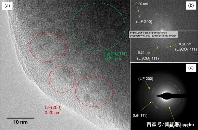 為了進一步分析電解液對于SEI膜微觀結構的影響,作者采用冷凍電鏡技術對SEI膜進行了分析。下圖a為在添加FEC的電解液中,-40℃條件下形成的SEI膜結構,從圖中能夠看到SEI膜呈現馬賽克的樣式,也就是具含鋰無機晶體顆粒分散在無定形的有機成分中的結構,其中無機成分主要是LiF和Li2CO3成分,而在之前的研究中發現,在純的醚類電解液中形成的SEI膜中的無機成分主要是LiF,并且LiF晶體顆粒的粒徑更小。