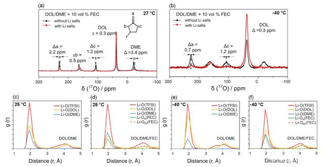 核磁共振能夠用來分析電解液的溶劑結構,核磁共振研究表明在醚類溶劑體系中Li+更加傾向與DME形成溶劑化結構,從下圖a可以看到常溫下在醚類溶劑中加入FEC后并不會對Li+與DME的溶劑化結構產生顯著的影響,但是我們也注意到FEC也會與Li+形成較強的溶劑化結構。