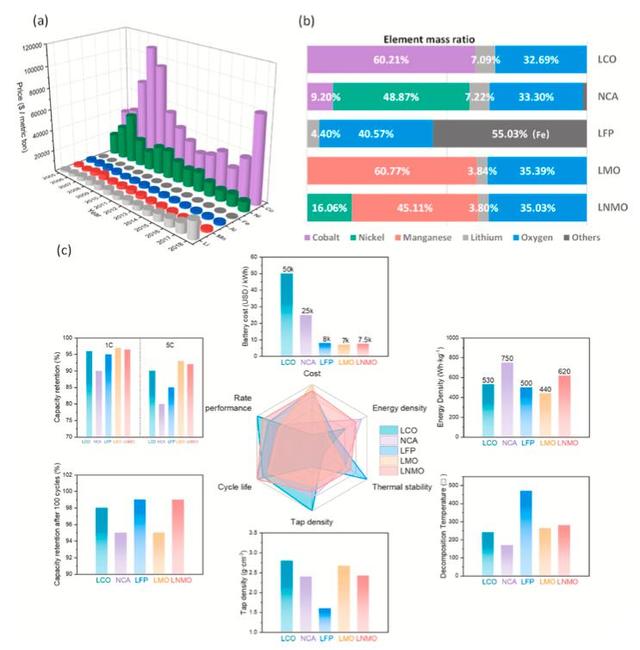實現無Co化,降低材料的成本是近年來正極材料的發展趨勢,下圖中作者總結了近年來正極材料中常見元素的價格走勢,可以看到所有原材料中Co元素的價格最高,并且波動最大,近年來則價格大幅攀升。此外Ni和Li元素的價格相對較高,近年來也處于持續走高的趨勢。我們對比不同類型的正極材料可以看到,高電壓的LNMO材料,不僅具有高電壓(4.7V)和高能量密度的優勢,同時其大量采用成本低廉的Mn元素,因此是一種理想的低成本,高能量密度材料。