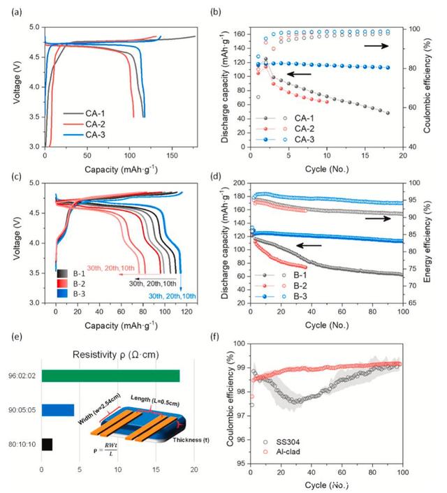 下圖e中作者采用四探針的方法分析了不同的導電劑配比下電極的電阻率,從圖中能夠看到活性物質的比例超過90%以后,電極的阻抗會出現顯著的增加,這會導致電池在工作過程中的極化顯著增加,因此在后續的測試中作者電極的配比為90:5:5。