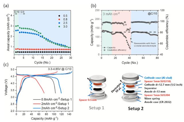 在下圖b中作者對3mAh/cm2的厚電極按照0.1C的倍率進行循環,從圖中能夠看到前30次中電極的容量只有輕微的衰降,但是在30次以后開始快速衰降,但是當我們將循環衰降后的厚電極解剖出來,再次組裝為扣式電池,則其容量可以完全恢復,這表明厚電極在循環過程中的容量衰降更多的是來自金屬鋰負極的衰降和電解液的分解。