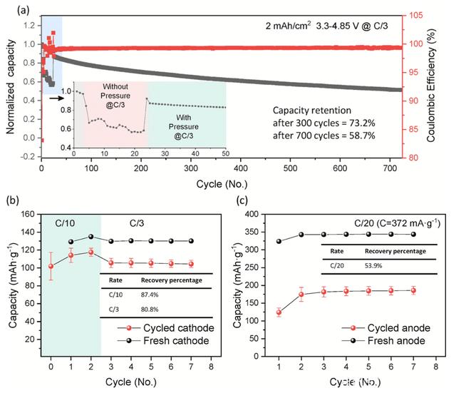 作者的實驗表明,通過對扣式電池的結構進行優化,留出一定體積的氣室能夠有效的改善厚電極的電性能,但是扣式電池組裝的過程中內部電極所承受的壓力是不可測的。為了進一步分析壓力對于電極性能的影響,作者采用2mAh/cm2的厚電極與石墨負極組合為單層軟包電池。電池在前三次化成循環過程中,作者對電池施加了1100kPa的壓力,隨后拆除夾板循環20次,從圖中能夠看到電池容量快速降低到了初始容量的60%,庫倫效率也變的不穩定,隨后作者又重新安裝夾板,施加壓力,可以看到電池的容量恢復到了初始容量的90%,電池的庫倫效率也變得穩定,在經過700次循環后,電池的容量保持率為58.7%。