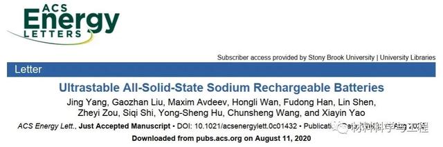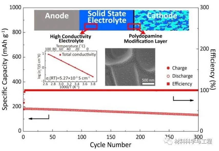 來自中科院寧波材料所姚霞銀研究員、中科院物理所胡勇勝研究員、美國(guó)馬里蘭大學(xué)王春生教授與上海大學(xué)施思齊教授(共同通訊作者)等人在NASICON型Na3Zr2Si2PO12材料中通過異價(jià)摻雜(Zn2+取代Zr4+,Si4+取代P5+),室溫電導(dǎo)率達(dá)到5.27*10-3 S/cm,同時(shí)組裝了FeS2||聚多巴胺-Na3.4Zr1.9Zn0.1Si2.2P0.8O12||Na全固態(tài)電池,通過在固態(tài)電解質(zhì)與正極之間添加聚多巴胺的改性薄層,來抑制體積變化,該電池在0.1C下100次循環(huán)后可保持高可逆容量236.5 mAh/g,0.5C下容量為133.1 mAh/g可循環(huán)300圈,表現(xiàn)出超級(jí)穩(wěn)定性和良好性能。相關(guān)論文以題為“Ultrastable All-Solid-State Sodium Rechargeable Batteries”發(fā)表在ACS Energy Letters。
