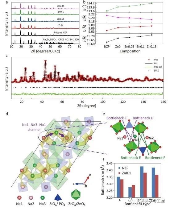 圖2. (a) Zn0,Zn0.05,Zn0.1,Zn0.15和原始的NZP的XRD圖;(b)Zn0, Zn0.05, Zn0.1, Zn0.15和原始的NZP的晶格參數(shù)的變化;(c)室溫條件下的Rietveld精修結(jié)果,紅色、黑色和綠色分別對(duì)應(yīng)實(shí)驗(yàn)值、計(jì)算值和差值;(d) NZP結(jié)構(gòu)在6eV的等值面下的BVEL圖;(e)Na1-Na3-Na1通道的C、D、E、F瓶頸位置;(f)NZP與Zn0.1體系中不同瓶頸位點(diǎn)的尺寸對(duì)比。Zn2+取代Zr4+改變了Na1-Na3-Na1通道中最小瓶頸的尺寸,增加了體系中的Na+含量,從而提高了Na+電導(dǎo)率。