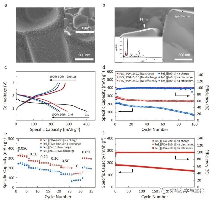 圖4. (a) Zn0.1樣品包覆聚多巴胺后的表面形貌;(b) Zn0.1樣品包覆聚多巴胺后的斷面SEM圖與EDS數(shù)據(jù);(c) 0.1C時(shí)60℃下FeS2||PDA-Na3.4Zr1.9Zn0.1Si2.2P0.8O12||Na電池的充放電曲線;(d) 0.1C時(shí)60℃下FeS2||PDA-Zn0.1||Na與FeS2||Zn0.1||Na電池的循環(huán)性能;(e) 60℃下FeS2||PDA-Zn0.1||Na與FeS2||Zn0.1||Na電池的倍率性能;(f) 0.5C時(shí)60℃下FeS2||PDA-Zn0.1||Na電池的循環(huán)性能