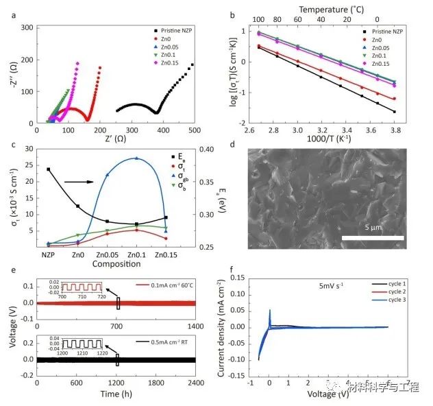 圖3. (a) Zn0、Zn0.05、Zn0.1、Zn0.15和原始的NZP的室溫阻抗圖;(b) Zn0、Zn0.05、Zn0.1、Zn0.15和原始的NZP的在1250℃氧氣中燒結(jié)的阿累尼烏斯圖;(c) Zn0、Zn0.05、Zn0.1、Zn0.15和原始的NZP的電導(dǎo)率和激活能;(d) Zn0.1在1250℃氧氣中燒結(jié)后的斷面形貌圖;(e) Na/Zn0.1/Na電池的恒電流循環(huán)結(jié)果;(f) Zn0.1樣品的循環(huán)伏安曲線。