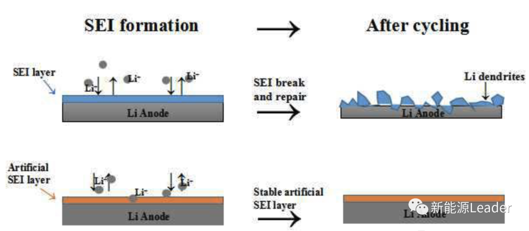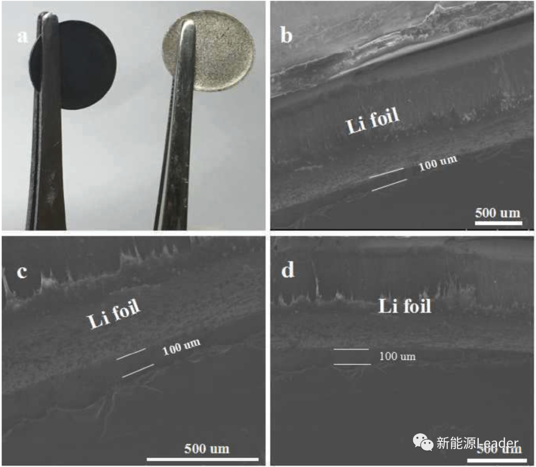 從下圖可以看到經過循環后,人造SEI膜仍然致密、光滑,從而使得人造SEI膜能夠有效的隔離金屬鋰和電解液,減少電解液在金屬鋰表面的分解。而普通金屬鋰負極的表面則產生大量的微孔和裂紋,這導致了電解液的消耗和鋰枝晶的生長。