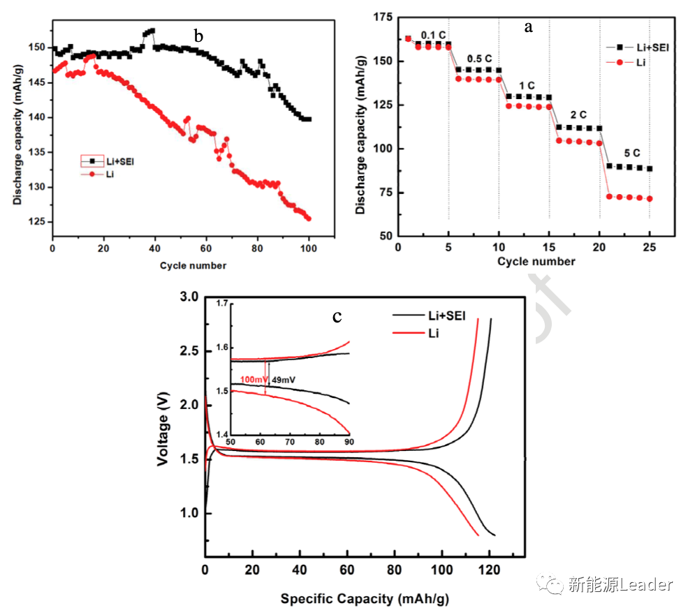 下圖a為上述電池的倍率性能測試曲線,可以看到在0.1C較小倍率下,兩種電池的放電容量基本都在160mAh/g左右,但是隨著倍率的提升,采用人造SEI膜金屬鋰作為負極的電池表現出了更好的倍率性能,這表明人造SEI膜的電導率要明顯好于在電解液中自然生成的SEI膜,這能夠有效的抑制枝晶的生長。下圖b為采用兩種金屬鋰負極電池的循環性能,從圖中能夠看到普通金屬鋰負極的電池循環性能較差,100次循環后剩余容量僅為107.5mAh/g,而采用人造SEI膜金屬鋰負極的電池在循環500次后容量保持率仍然可達117mAh/g,這表明人造SEI膜能夠有效的抑制枝晶的生長,提升金屬鋰二次電池的循環穩定性。