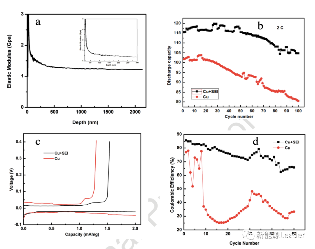 下圖a中作者對這層人造SEI膜的機械特性進行了分析,從圖中可以看到這層人造SEI膜的彈性模量為1.3GPa,研究表明1GPa的彈性模量就能夠有效的阻止鋰枝晶的生長。下圖b為LTO為正極,分別以普通銅箔和人造SEI膜的銅箔作為負極的電池的循環性能,從圖中能夠看到無論是從容量發揮,還是從循環性能上,采用人造SEI膜銅箔作為負極的電池都要明顯好于普通銅箔的電池。此外從下圖d所示電池庫倫效率可以看到采用普通銅箔負極的電池初始庫倫效率僅為70%左右,隨后快速降低到了30%,而采用人造SEI膜銅箔則在循環中則穩定在了65%左右。