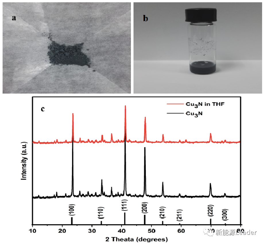 下圖a為采用上述方法制備的Cu3N粉末,該粉末顏色為灰色,下圖c為Cu3N粉末的XRD圖譜,從圖中能夠看到樣品的特征峰能夠完全與標準卡片匹配,粉末中沒有出現明顯的雜質,僅有少量參與的Cu2O。同時從圖中能夠看到Cu3N粉末能夠比較穩定的在TFH存在,不發生明顯的分解。