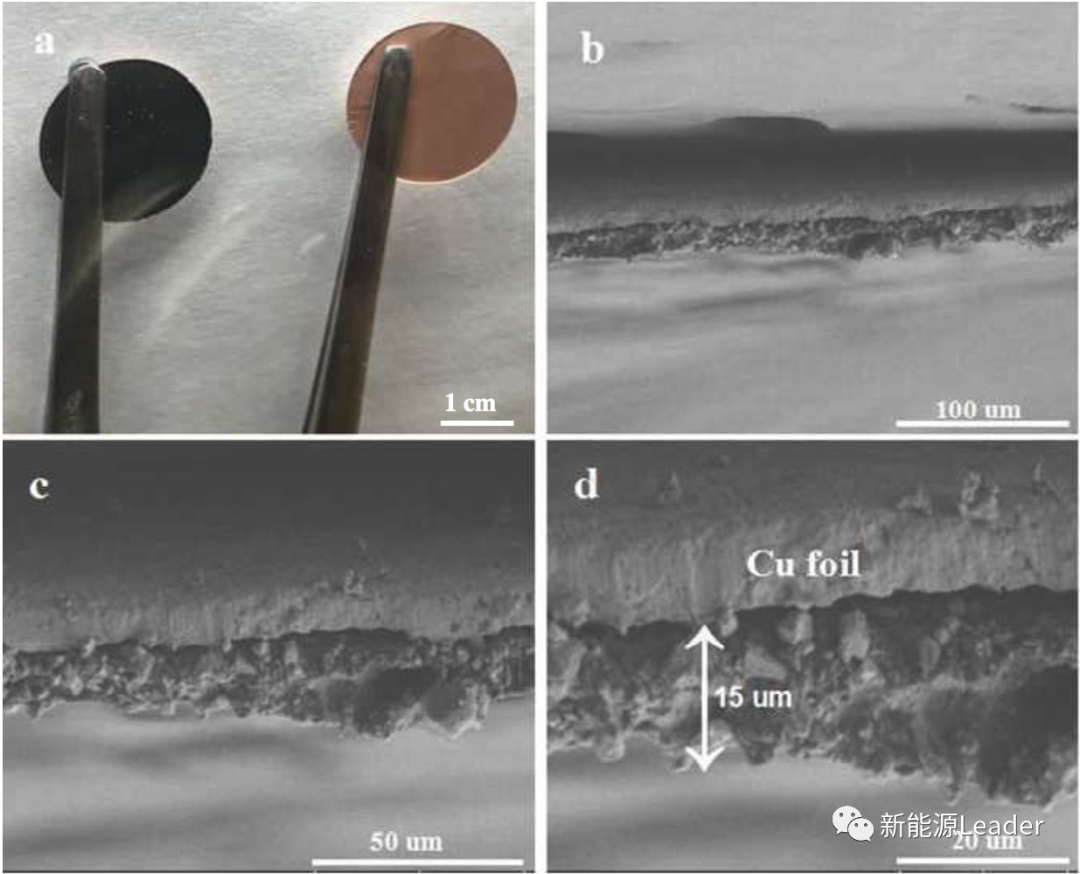 下圖a為普通銅箔和表面涂布Cu3N粉末的銅箔,通過下圖所示的SEM圖可以看到,盡管銅箔在制樣的過程中產生了一定的破壞,但是Cu3N粉末涂層仍然能夠較好的粘接在銅箔表面,表明涂層具有良好的粘接性。