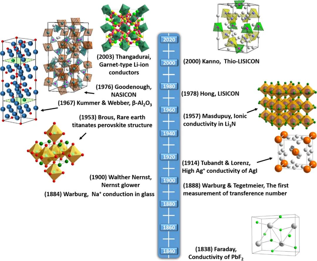 首先,作者帶我們簡要回顧了固態離子學研究的發展歷程以及固態鋰離子導體的由來。從1838年法拉第發現PbF2的離子傳導現象到如今的固態離子導體家族百花齊放,從機理闡釋到材料設計、合成,將近兩百年的研究接力和新發現,固態離子學在理論和應用方面均取得了極大的成就。石榴石型型鋰離子導體在Thangadurai等人的首次報道之后,因其對Li金屬的穩定性引起了對其作為鋰離子電池固態電解質的廣泛研究。石榴石型電解質可分為四個不同的亞型,在寬的鋰含量范圍內,含鋰石榴石型的離子電導率幾乎隨鋰含量呈指數增長。Murugan等人在2007年首次報道了立方結構的Li7La3Zr2O12,其在石榴石型結構家族中的電導率最高,因此受到了持續的關注。