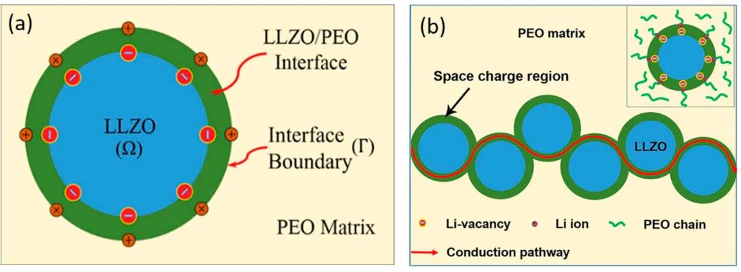 圖3. (a)PEO / LLZO復合材料中LLZO納米粒子的示意圖;(b)沿著界面空間電荷區域的快速離子傳導途徑示意圖。