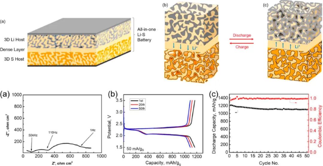 圖4.(a)基于LLZO電解質的三層Li-S電池的示意圖,其中LLZO的相對的CNT涂層多孔層中有Li金屬和S;(b)放電和(c)充電期間的三層電池示意圖;(d)具有三層LLZO電解質的Li-S電池的EIS,(e)電壓曲線和(f)循環壽命。
