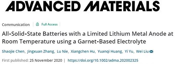 近日,上海科技大學Wei Liu團隊以“All-Solid-State Batteries with a Limited Lithium Metal Anode at Room Temperature using a Garnet-Based Electrolyte”為題,在Advanced Materials上發表最新研究成果,報道了一種基于石榴石型氧化物固體電解質的全固態鋰金屬電池,具有超低的負極/正極(N/P)容量比。